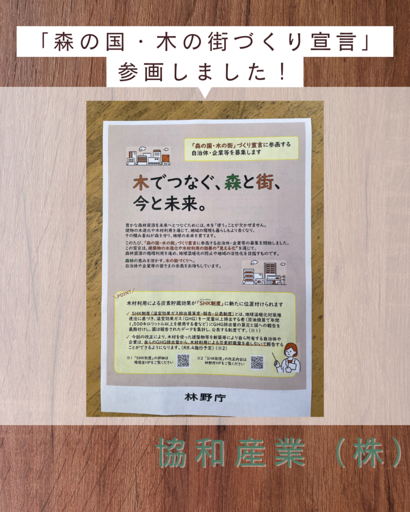 ニュース 26.01.08 新たな試み♪ 林野庁が推進する企画 「森の国・木の街づくり宣言」に弊社も参画しました! 木でつなぐ、森と街、今と未来 地域の環境と暮らしを「木」をつかうことで守る 木造住宅、そして木のある暮らしが普及するお手伝いができれば・・・ 自治体、企業としてできることをはじめる機会をいただきました 未来のために今できることをコツコツと。。。 皆さんと共有できたら幸いです